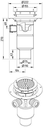 BLÜCHER Domestic-150 afløb for vinylgulve, med sideindløb og lodret Ø75mm udløb.