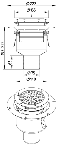 BLÜCHER Domestic-150 justerbar afløb for vinylgulve, med lodret Ø75mm udløb.