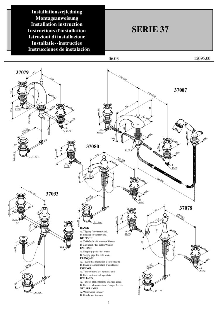 Damixa Tradition 3-hulsbatteri med fast tud. Med bundventil, keramisk regulering. Specifikationer: