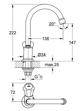 Grohe Costa L standhane Kan bruges til enten varmt eller koldt vand. Specifikationer: