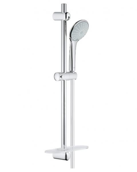 GROHE Euphoria 110 Duo sæt med brusestang (600 mm), to strålemønstre Med dette Grohe Euphoria brusesæt kan du nyde Grohe's anerkendte strålemønster, der føles som varm sommerregn på huden. Du kan opleve den i to versioner: Almindelig Rain og SmartRain, som bruger mindre vand men giver samme afslappende oplevelse. Brusesættet her indeholder alt du har brug for til et komplet brusebad - du får endda en Grohe EasyReach bakke med i købet, så du altid kan have shampoo og sæbe lige ved hånden. I ren krombelægning får du et stilrent brusesæt, som nemt kan matches med andet badeværelsestilbehør i krom. Med justerbart vægbeslag er det muligt at tilpasse brusestagens montering til eksisterende huller, så du kan slippe for at bore nye huller. Praktisk! Sættet består af: