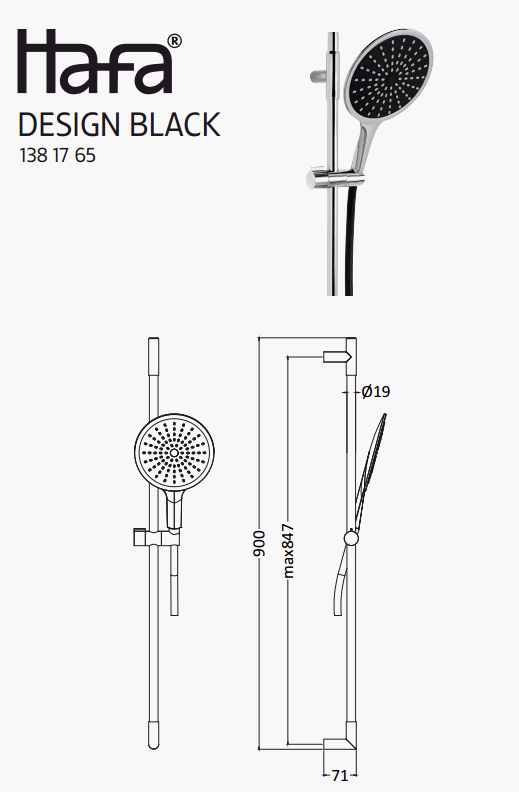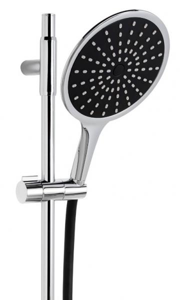 Bruseset i krom og sort med brusestang i metal. Sort bruserslange med AntiTwist og ekstra stort brusehoved Ø 170. Brusestang med justerbare vægbeslag 350-847 mm. Brusesetet indeholder sæbeskål.