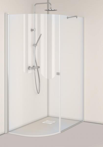 Brusehjørne med en svingbar J-dør og en fast brusevæg. Dørene er vendbare og kan derfor højreeller venstremonteres. Brusestangen kan monteres på tre måder: på væggen, i loftet eller vinkelret på samme væg, hvor bruseren monteres. Det er monteringsvenligt og har limbare profiler i aluminium. Nemt at installere og justere for én person, InstaQuick™. Henholdsvis 6 mm og 8 mm hærdet sikkerhedsglas. 8 mm frihøjde fra gulvet. Højde 2000 mm.  Kan monteres med udvendige 12-mm-rør, cc 35 mm.  Der fås en forlængelsesprofil til udvendige rør. 18 mm glideskinne medfølger