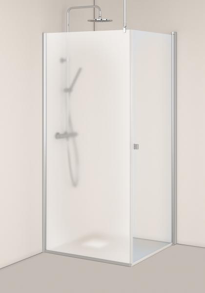 En fast brusevæg og en svingbar dør monteret i hjørne eller i nische.