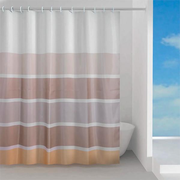 Badekarsforhæng med brede, vandrette striber i varme farver. Ikke nok med at du undgår vandsprøjt i hele badeværelset, du holder også den varme damp inde i badet og skabe varme i indretningen.
