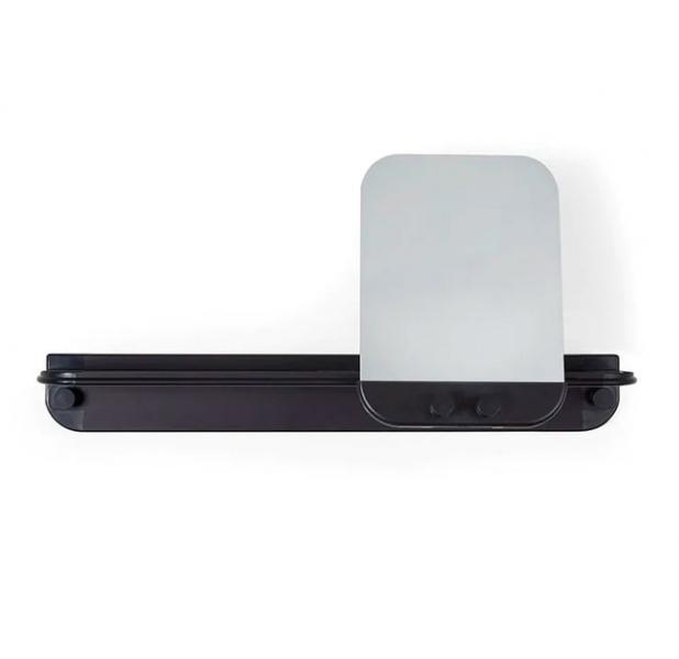 HeFe GLIDE hylde til badet med spejl - sort aluminium Aluminiums hylde med kroge og dugfrit spejl. Monteres med silikone og dobbeltklæbende tape. Belastning max 9 kg.
