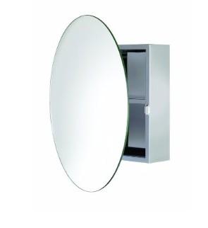 Skab med rund spejllåge. Diskret opbevaring til små badeværelser. Skab og intern hylde i rustfrit stål,  kommer samlet, inkl. alt til montering.