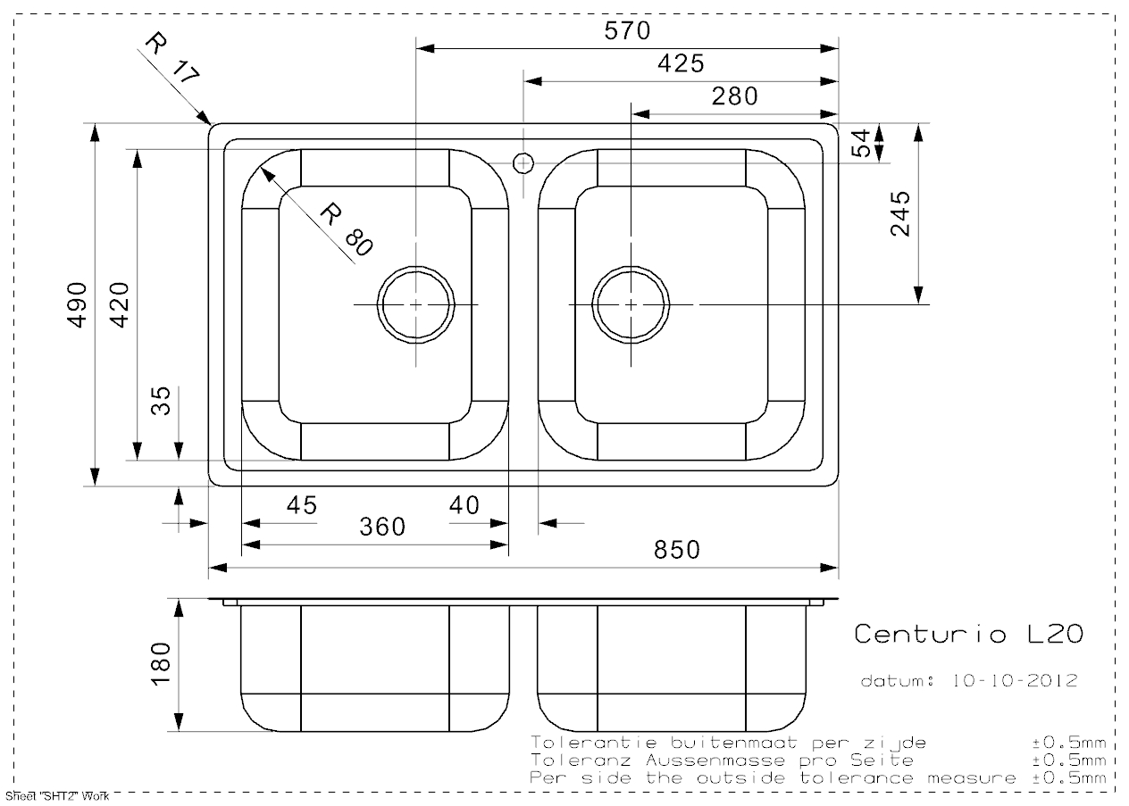 Rustfri dobbeltvask i stål. De indvendige runde hjørner giver et harmonisk design, ligeledes er de indvendige runde hjørner rengøringsvenlige.