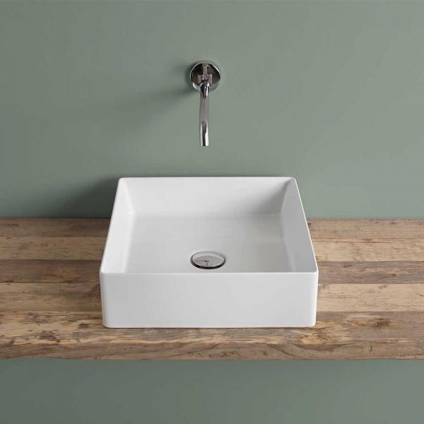 Porcelænsvask i kvadratisk design, uden hanehul og overløb.