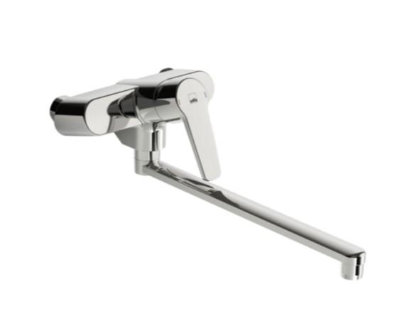Vægarmatur med svingtud (300 mm). Mulighed for begrænsning af temperatur og vandmængde.