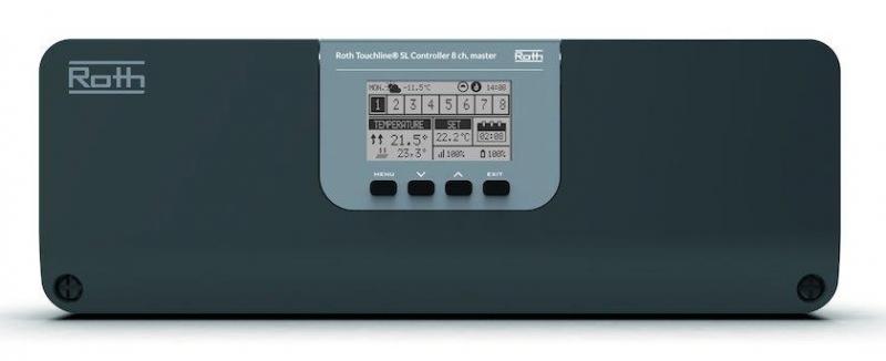 Roth Touchline® SL kontrolenhed 8 kanaler, master. Der kan tilmeldes op til 8 rumtermostater med op til 4 stk. 230 V termomotrer på hver output. Man kan også vælge at én rumtermostat skal styrer flere output, f.eks hvis der er 6 kredse i et rum.