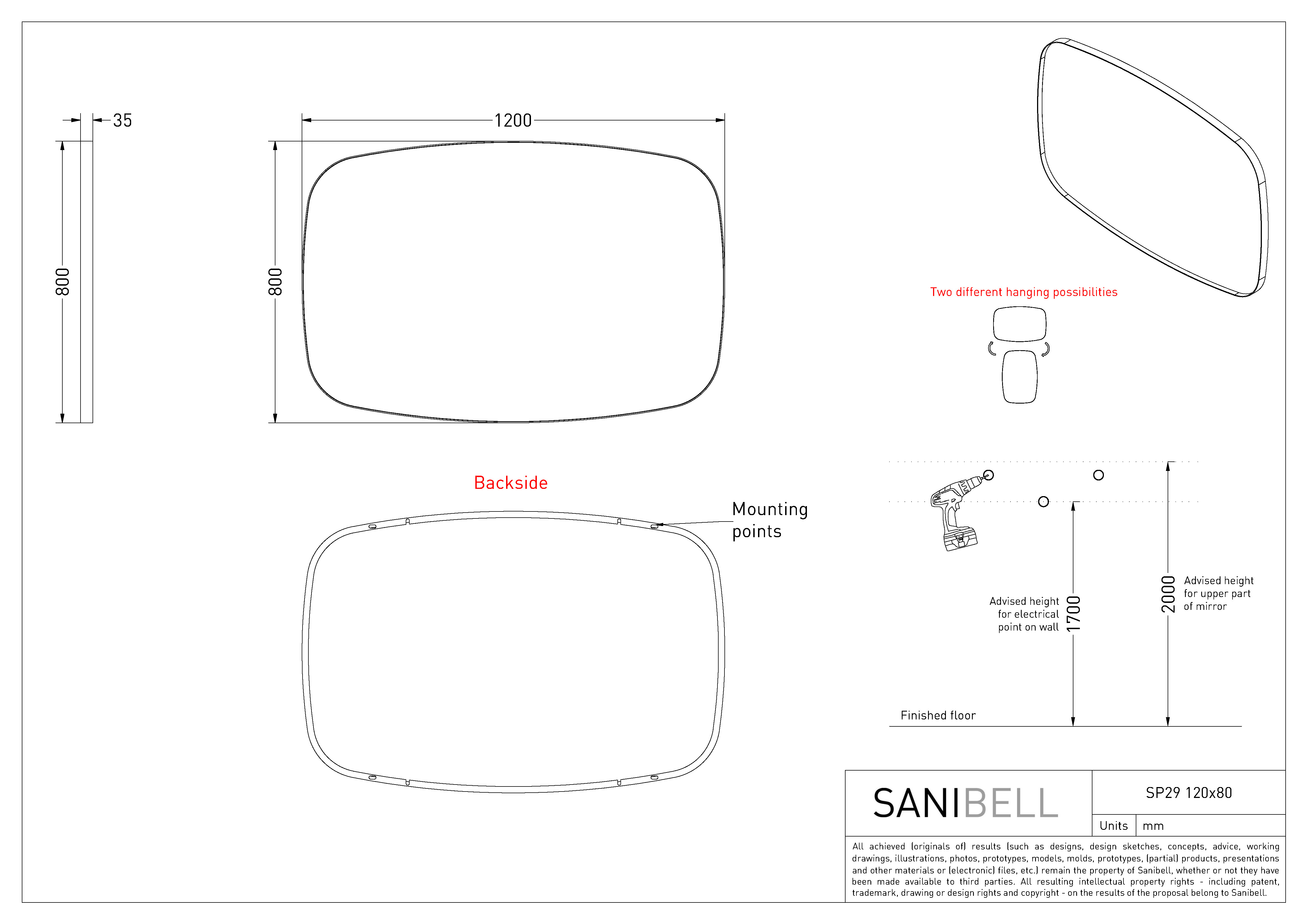 Minimalistisk spejl med ramme, som forfra er helt slank, men fra siden træder frem fra spejlets profil. Formen er superellipse og dermed ikke helt rund, og ikke helt firkantet.