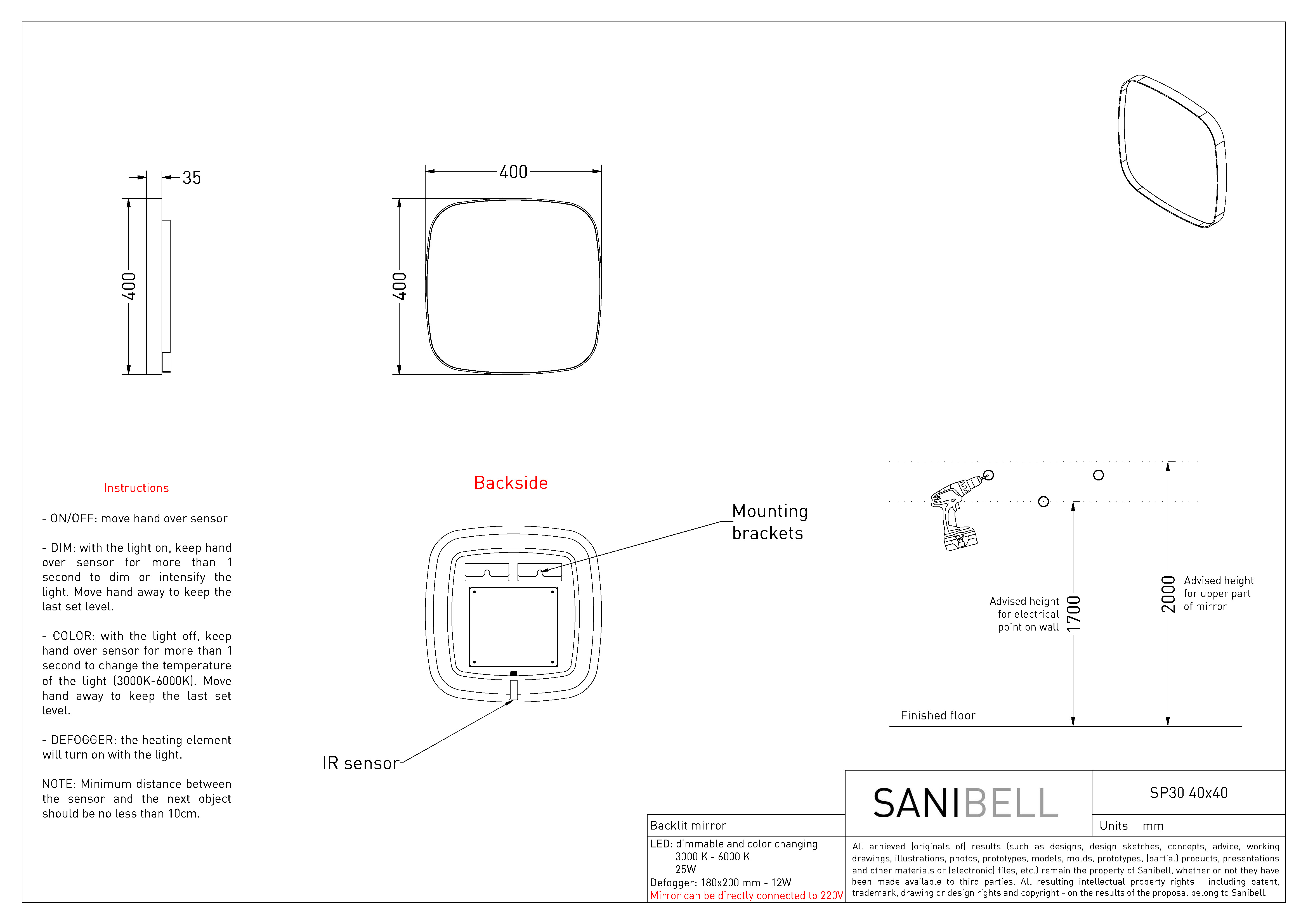 Sanibell Ink SP30 superellipse spejl m/backlight, varme og sensor 40 x 40 cm - Mat hvid Sanibell Ink spejl i superellipse form: Den afrundede firkantede form er både bryder linjerne på badeværelset, men virker på samme tid samlende for det visuelle udtryk i indretningen. Spejlet er indrammet af en flot ramme, som er slank forfra, men fra siden er bredere. Spejlet lyser væggen bag sig op med sit indirekte lys, som kan justeres i både styrke og farvetemperatur ved brug af sensorkontakten i bunden af spejlet. Udover backlight har spejlet også indbygget varmefelt, hvilket betyder at du kan nyde den luksuriøse oplevelse af et dugfrit spejl - selvom om du lige har taget et langt varmt bad. Specifikationer: