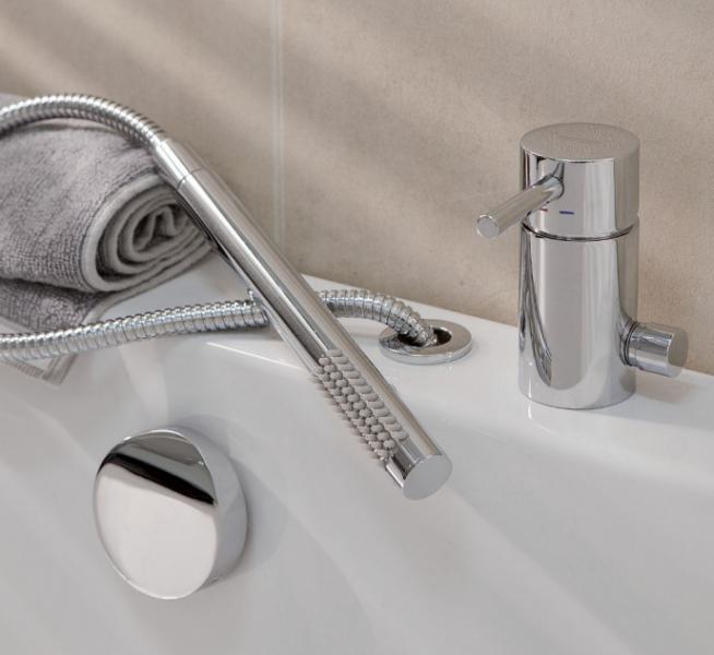 Strømberg Et-grebs armatur med håndbruser. Vandpåfyldning gennem overløb inkl af-overløbssæt