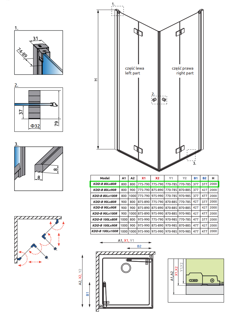 Strømberg Noma 110 bruseniche m/foldedøre - 80x80 cm - Klar glas/mat sort