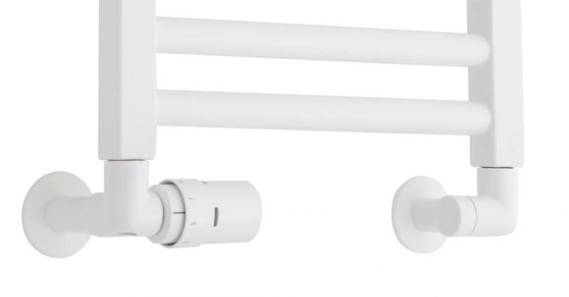 TVS Ventilsæt type 121 m/returtermostat, venstre, vinkelløbende - Hvid Retur ventilsæt type 120 er vinkel ventilsæt med retur termostat som bruges når man skal have sin håndklædetørrer monteret på central- / fjernvarmesystemet. Brugen af denne type ventil kræver at der kommer rør ud fra væggen. Man vil typisk bruge denne type ventil hvis man ønsker en løsning hvor man jævnligt gerne vil stille på temperaturen. Denne type ventil anbefales til fjernvarme. Reguleringen er termostatstyret og dette gør den nem at indstille til den ønskede temperatur. Termostaten skal sidde på den side hvor returvandet kommer. Termostaten vil så sørge for at vandet i håndklædetørreren har en fast og ensartet temperatur. Type 120 og 220 er til de varmesystemer hvor returvandet kommer i højre siden og type 121 og 221 er til venstre side. Til disse ventilsæt medfølger rør afdækninger med rosetter i samme overflade Specifikationer: