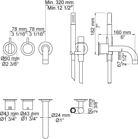 Vola Et-grebsblander for stor vandmængde med keramisk ventilenhed og omskifter samt løs afgangsmuffer. Fast udløb, 160 mm, ø24 mm T2 Håndbruser med metalslange og holder Rosetter Krom 16 ½''RG/PEX