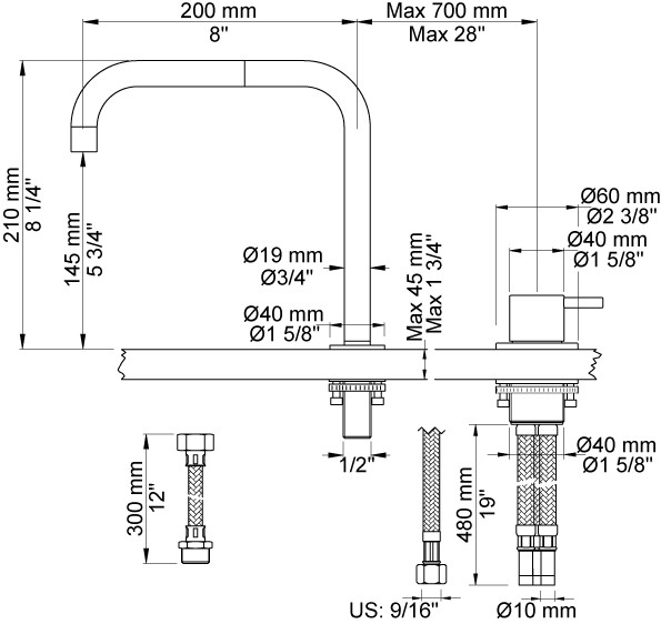 Vola køkkenbatteri model 590. Et-grebsblader med keramisk ventilenhed, for sargmontage 500, og 090 med vandbesparende luftindblander.