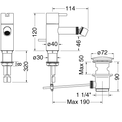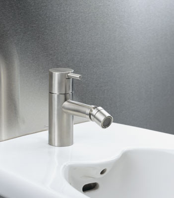 Vola HV4 bidetbatteri. Et-grebsblander med keramisk ventilenhed, fast tud, med justerbar luftindblander og løft-op bundventil 1 1/4.